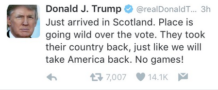 Following the Brexit vote, Donald Trump, who was in Scotland to open a golf course, tweeted: