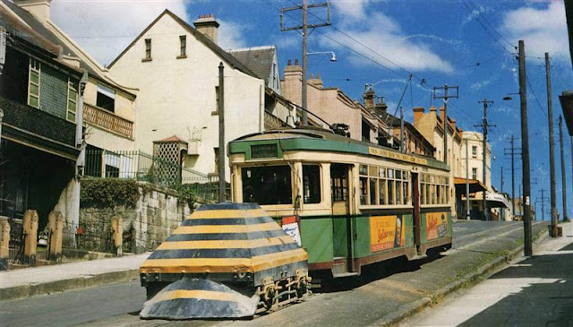 The ferry stop at the end of Darling Street, Balmain involved a steep ascent/descent that originally saw tram passengers having to get off and walk the last kilometre.  Due to passenger dissatisfaction, the government of the day came up with a solution.  A system of cables and hydraulics, with counterweights, was established with underground tunnels to assist in going uphill and check speed in going downhill.  It was known as The Balmain Dummy and the aboveground bit is shown above.  The counterweight system was discontinued in 1955.
