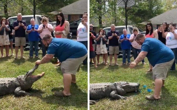 The Dickey gender reveal happened by way of accident, what could have gone terribly wrong but didn’t was when Louisiana man Mike Kliebert revealed the gender of the baby his wife Rebecca was carrying. He put a hollowed out watermelon in the mouth of a FBA (big alligator) which sprayed blue jello when the FBA chomped down on it. Mike and his wife are alligator wranglers and he said afterwards "Being that alligators are part of our family, we wanted to include them in our gender reveal.” That might hold true for Mike but what is equally alarming is the number of people standing close by watching, including his pregnant wife and their son (who has to get out of the way of the gator). Here is the video clip, watch to the end . . .