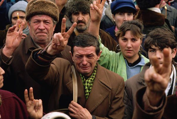 1990: David C. Turnley – “The Romanian Revolution.” Romanian people celebrating the end of communism with tears in their eyes and peace signs in the air.